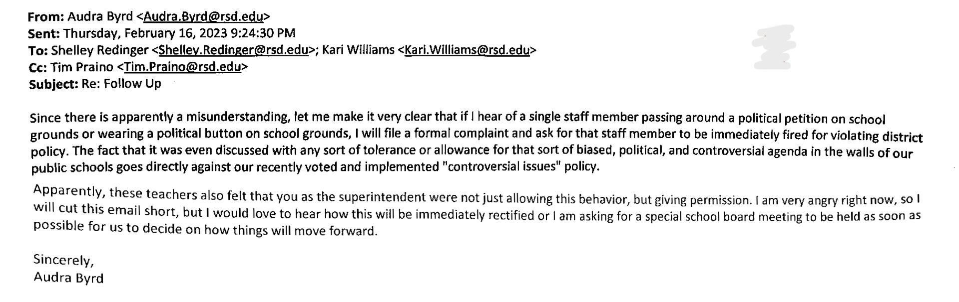 On Feburary 16, 2023, Director Byrd wrote the following in an email to Superintendent Dr. Redinger, Director Williams, and the Head of Human Resources for RSD, Tim Praino: "Since there is apparently a misunderstanding, let me make it very clear that if I hear of a single staff member passing around a political petition on school grounds or wearing a political button on school grounds, I will file a formal complaint and ask for that staff member to be immediately fired for violating district policy."